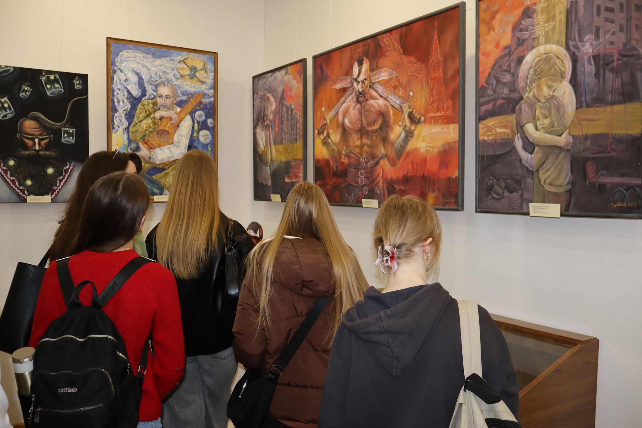 "У картинах багато болю, але надію вселяє "Сучасний Мамай", де козак у військовій формі з протезованою ногою, тримає в руках ядро чи то гранату. Зверху летить дрон, а він, знай, говорить із невидимими силами і посміхається. Це символ нашого Харкова і інших міст України", - діляться враженнями від виставки працівники